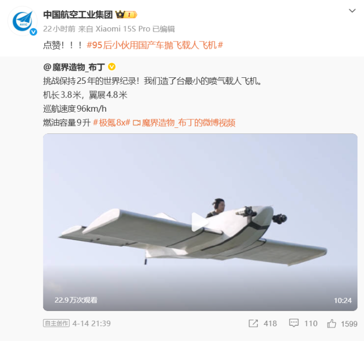 更让人热血沸腾的是,航空“国家队”——中国航空工业集团官微连发三个感叹号点赞。要知道,这家央企造出了歼-20、运-20、直-20等国之重器。能得到它的认可,说明这次事件的意义早已超越了一次网红挑战,而是中国制造从“地面”向“天空”的一次自信宣言。